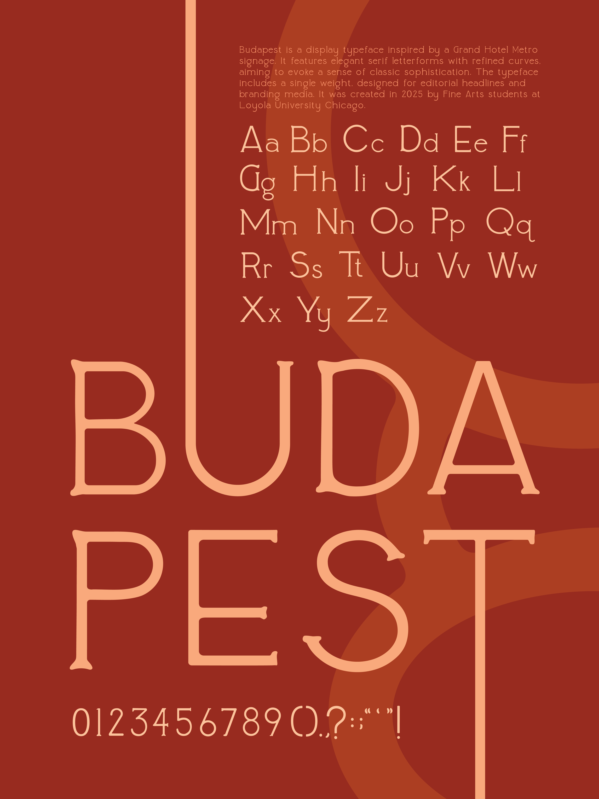 Budapest is a display typeface inspired by a hand-lettered signage. It features elegant serif letter-forms with refined curves, aiming to evoke a sense of classic sophistication. The typeface includes a single weight, designed for editorial headlines and branding media. Created in Fall 2025 by Fine Art students at Loyola University Chicago.